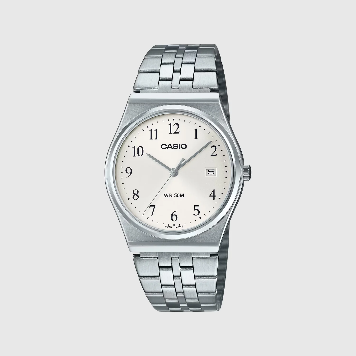 Casio Standard MTP‑B145D‑7BVDF is a sleek, retro-inspired analog watch with a clean white dial and stainless steel case and bracelet. It features a slim 40×35 mm case, mineral glass, 50-meter water resistance, and a one-touch 3-fold clasp. Powered by a quartz movement with ~3-year battery life and ±20 sec/month accuracy.