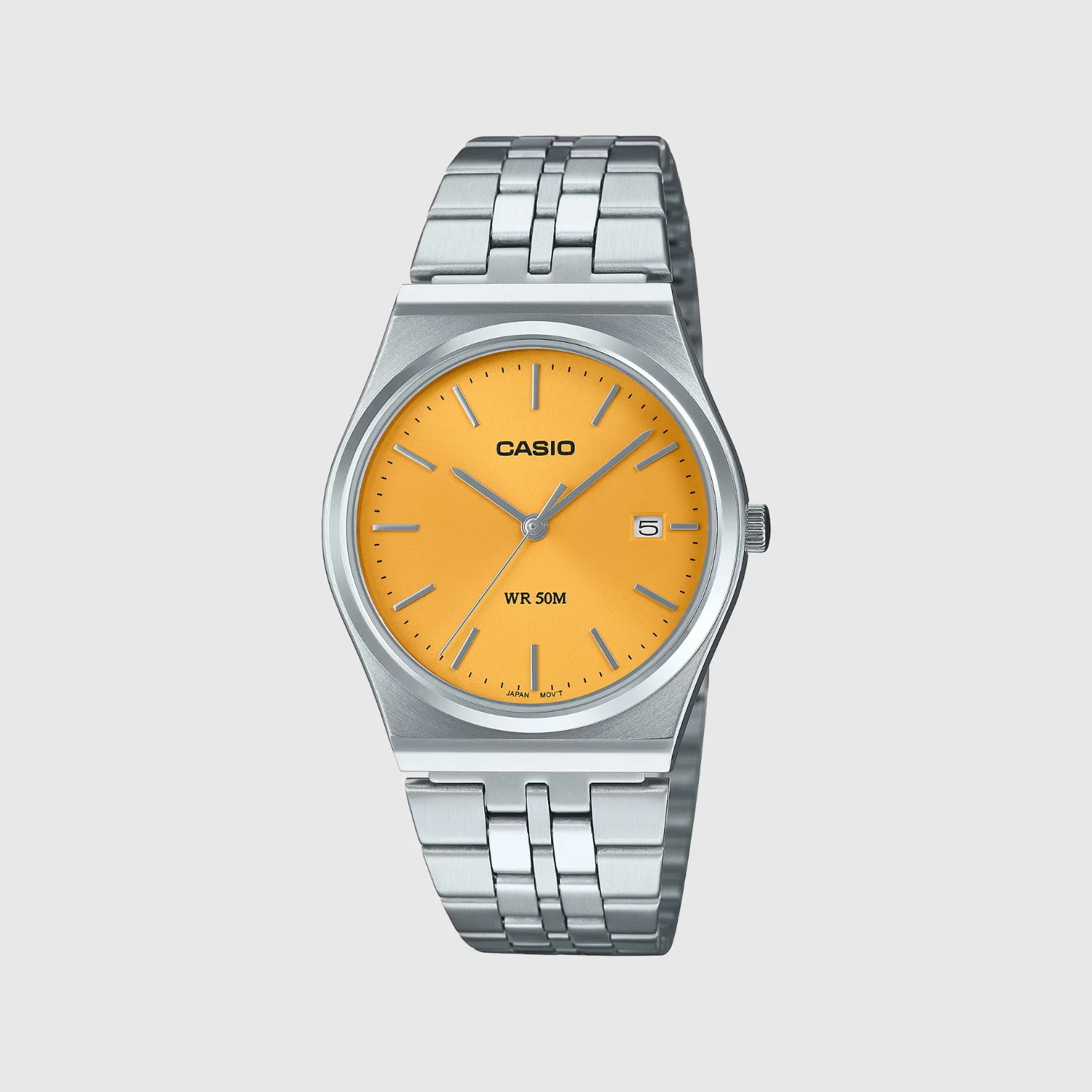 Casio Standard MTP-B145D-9AVDF Watch – Stylish yellow dial analog watch with stainless steel case and bracelet. Quartz movement ensures accurate timekeeping, while 50m water resistance makes it perfect for everyday use. Features a date display, mineral glass, and durable one-touch 3-fold clasp. Affordable, retro-inspired, and reliable for men and women.
